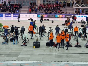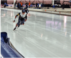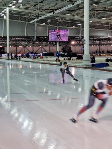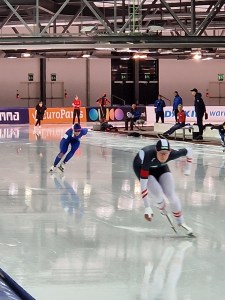 Inga vatning før 1500 m. Speakeren gjer merksam på banerekorden: Heather Bergsma 1.54,92.
